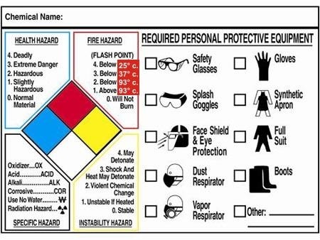 השתמש בציוד מגן אישי עפ"י המסומן במדבקה האדומה ודף הבטיחות בדוק תקינות שואבי עשן, מנדף השלך פסולת מסוכנת למיכלים ושקיות אדומות הכר את דף הבטיחות על בוריו - לכל חומר כימי קיים גיליון בטיחות הנקרא MSDS ( MATERIAL SAFETY DATA SHEET) אשר מכיל 16 סעיפים הכוללים בין היתר: פרטי יצרן, הרכב כימי, רמות חשיפה, תנאי אחסון, סכנות בריאות, דרכי טיפול. |